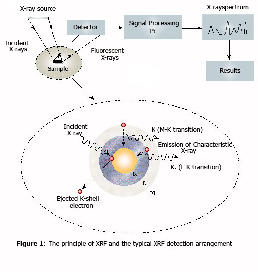 X-ray fluorescence spectroscopy (XRF) is universally recognized as a very accurate method of measuring the atomic composition of a material by irradiating a sample with high energy photons such as x-rays or gamma rays and observing the resulting x-ray fluorescence emitted by the sample. |